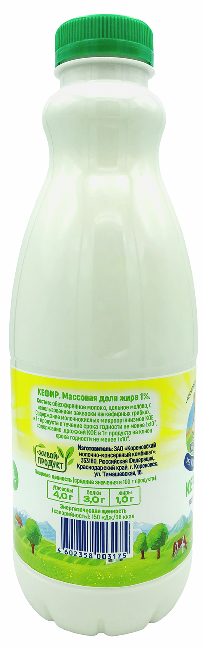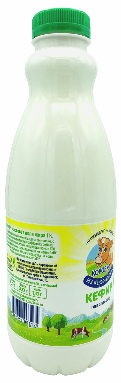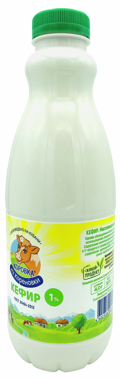 Кефир Коровка из Кореновки жирностью 1% изготавливается по особому рецепту. В состав продукта входит только натуральное молоко, свежие сливки и живая закваска. Напиток обладает нежным вкусом с практически неуловимой кислинкой. Подходит для самостоятельного употребления, приготовления салатов, выпечки и других блюд.