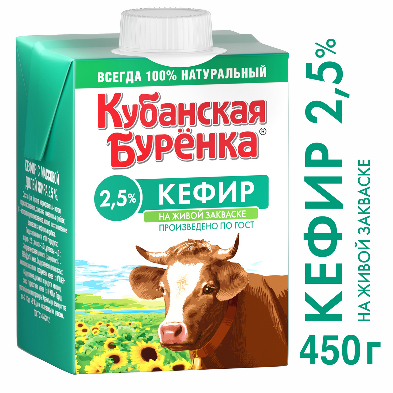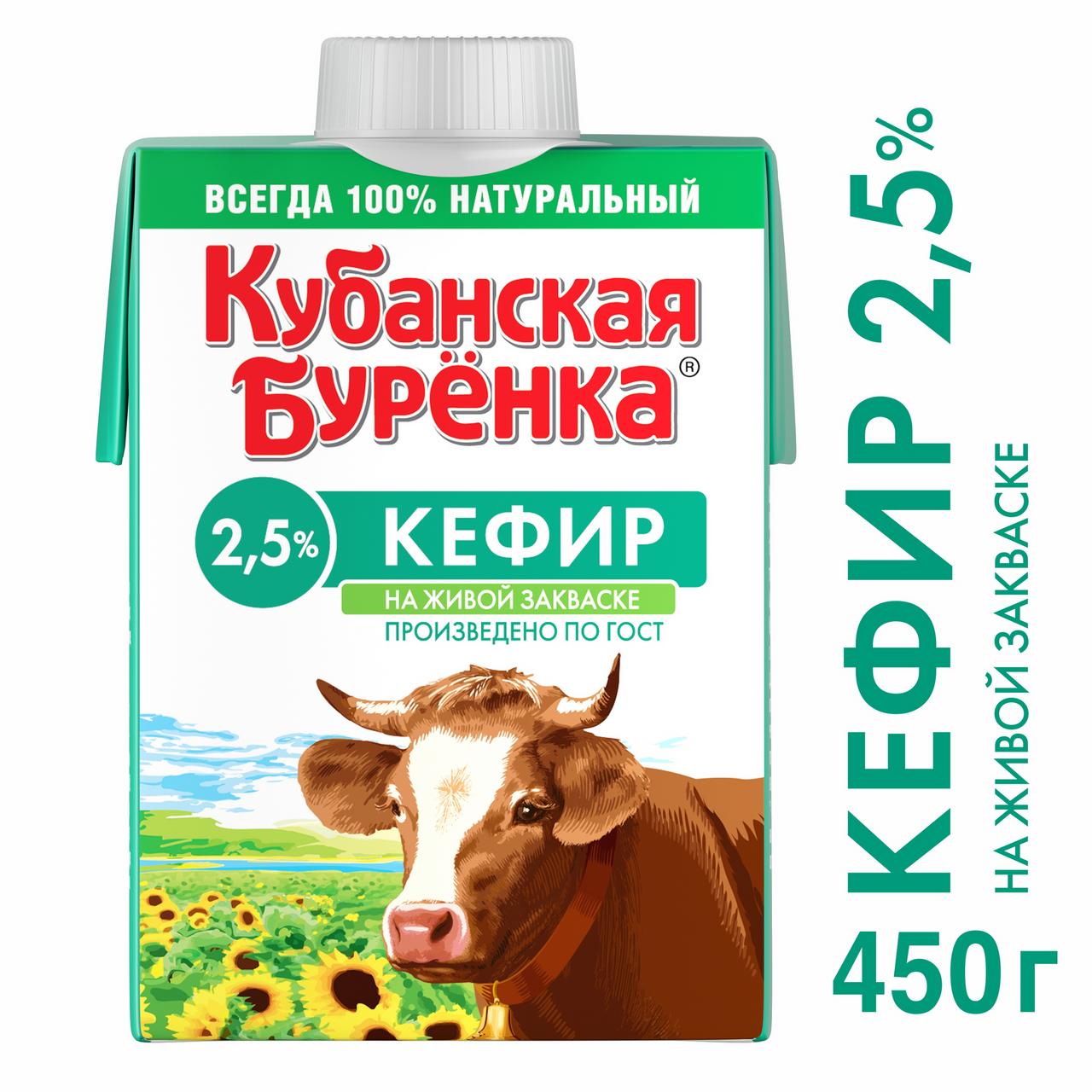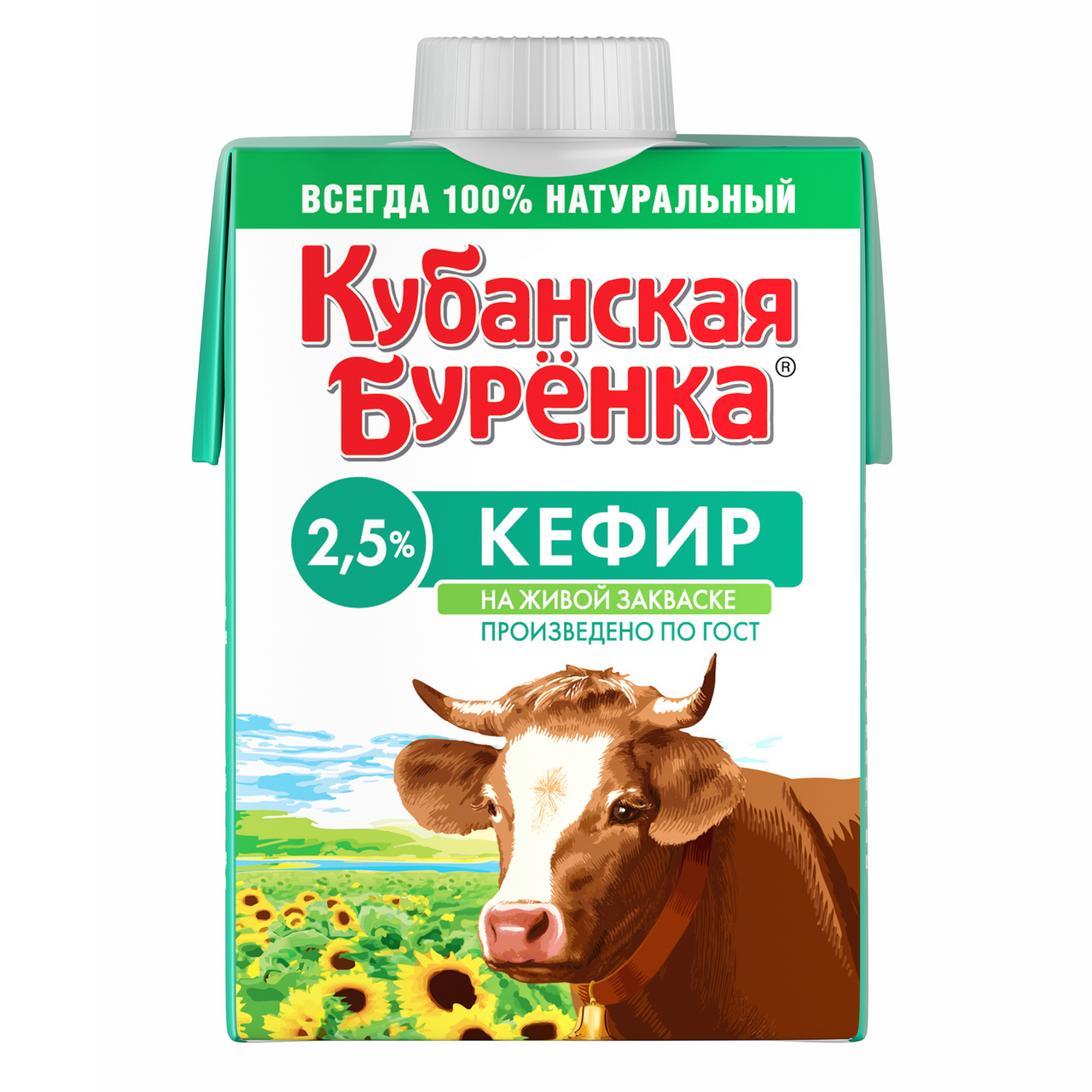 Кефир Кубанская буренка - нежный и вкусный кефир. На живой закваске. Идеально подойдет для утоления легкого голода вечером перед сном Кубанская буренка — это натуральные молочные продукты высочайшего качества из Кубани для здорового питания. Основа марки — традиционные молочные продукты: молоко, кефир, сметана, творог, ряженка, сливки, и сливочное масло. Для производства продукции Кубанская Буренка молоко закупается более чем в 50 лучших хозяйствах Краснодарского края, где коровы пасутся на залитых ярким солнцем плодородных землях, а ухаживают за ними с большой любовью и заботой."