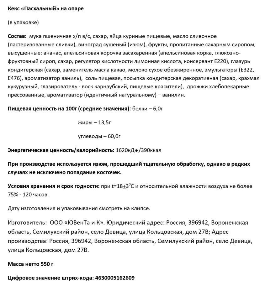Мука пшеничная хлебопекарная высшего сорта, сахар, яйца куриные пищевые, масло сливочное (пастеризованные сливки), виноград сушеный (изюм), фрукты, пропитанные сахарным сиропом, высушенные: ананас, апельсиновая корочка засахаренная (апельсиновая корка, глюкозно-фруктозный сироп, сахар, регулятор кислотности лимонная кислота, консервант E220), глазурь кондитерская (сахар, заменитель масла какао, молоко сухое обезжиренное, эмульгаторы (E322, E476), ароматизатор ваниль), соль пищевая, посыпка кондитерская декоративная (сахар, крахмал кукурузный, глазирователь - воск карнаубский, пищевые красители), дрожжи хлебопекарные прессованные, ароматизатор (идентичный натуральному) - ванилин.