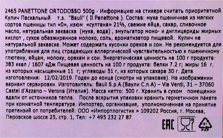 Кулич Bauli Panettone Пасхальный с изюмом, 500г