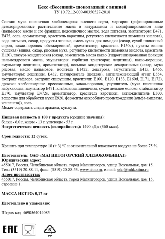 Кекс Весенний шоколадный с вишней, 170г
