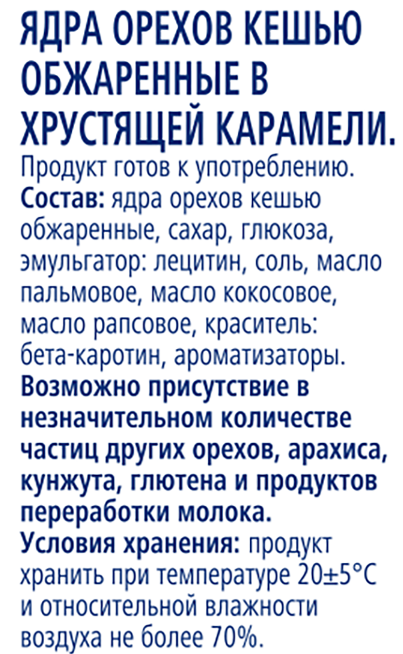 Кешью METRO Chef В карамели, 150 г – это сладкие хрустящие орешки, которые можно употреблять в натуральном виде или использовать как вкусный десерт к чаю и кофе. Следует учитывать, что они калорийные, поэтому в день рекомендуется употреблять не более 30-40 г. Ядра, обжаренные с карамелью, очень питательны, быстро насыщают и исключают чувство голода. Они обладают нежным, слегка маслянистым вкусом, и плотной текстурой. Упаковка орехов будет уместна во время прогулки в парке, в обеденный перерыв на работе или когда отсутствует возможность полноценно пообедать. Невесомая, компактная пачка с легкостью поместится в отсеке сумки или боковом кармане рюкзака. Кешью также используются в кулинарии: их можно слегка подробить и добавить в начинку для блинчиков, рулетов и п��рогов. Цельные орешки украсят торт, эклер, пирожное или кекс. Ядра содержат витамин С и витамины группы В, цинк, фосфор, кальцием. За счет этого они оказывают положительное воздействие на организм, укрепляют иммунную систему, улучшают работу головного мозга. Ненасыщенные жирные кислоты Омега-3 и Омега-6 помогают нормализовать состояние волос, кожи и ногтей.