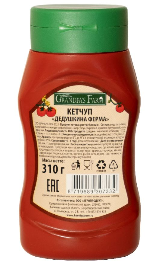 Вода питьевая, паста томатная концентрированная, сахар, уксус спиртовой, крахмал кукурузный, соль пищевая.