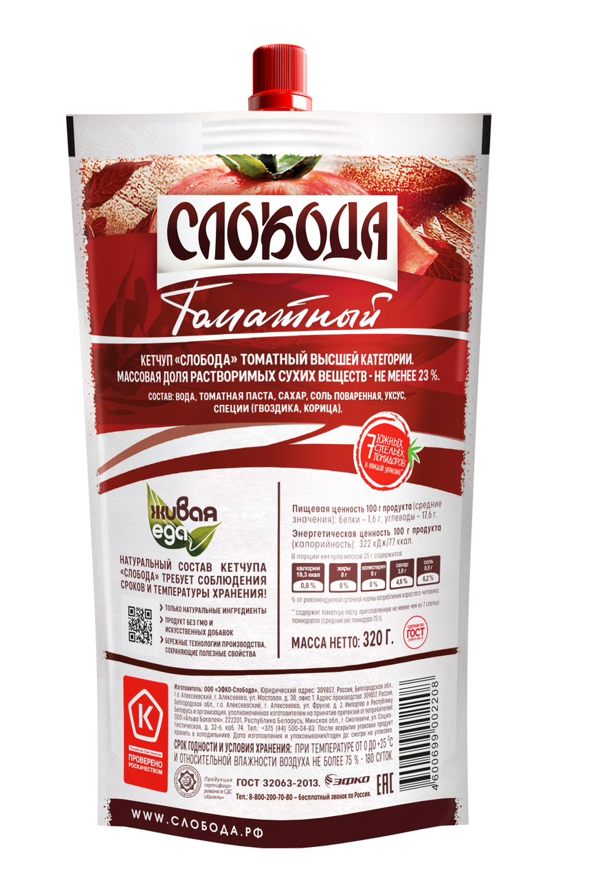 Слобода Томатный — традиционный соус из спелых томатов с ярким вкусом и тонким ароматом специй. Кетчуп изготавливается только из натуральных ингредиентов, которые проходят тщательный контроль качества. Густой, с идеальным балансом вкуса, кетчуп Слобода подчеркнет достоинства любого блюда. Он прекрасно сочетается с жареным картофелем, колбасками, любым мясом и птицей, а также идеально подойдет в качестве соуса для шаурмы и бургеров. С кетчупом Слобода ваши рецепты заиграют новыми красками! Слобода — бренд, который знают и любят многие россияне уже на протяжении 30 лет. Все продукты Слобода производятся с использованием бережных технологий и современного оборудования. Они не просто соответствуют ГОСТу, а обладают настоящей силой природы и изготавливаются с заботой о будущем!