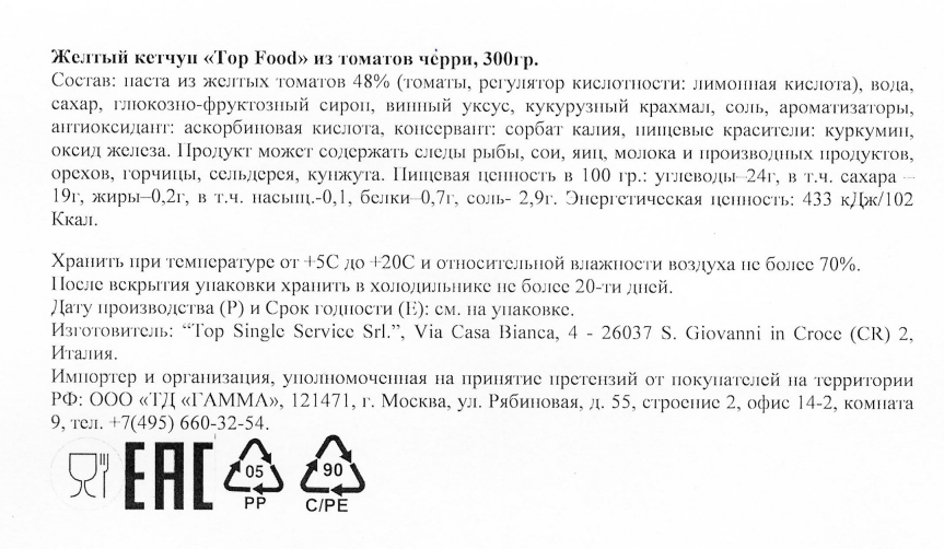 Кетчуп Top Food желтый из томатов черри без глютена, 300г