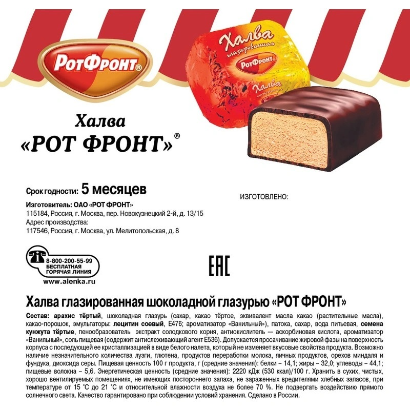Рот фронт Халва в шоколадной глазури, 1 кг отличается ярко-выраженным, интересным вкусом и приятным ароматом. Она покрыта глазурью из темного шоколада. Лакомство обладает слоистой структурой, которая слегка хрустит на зубах, раскрывая всю сладость. Отлично сочетается с разными горячими напитками: чаем, кофе или какао. Станет хорошим дополнением как к праздничному, так и обеденному столу. Может понравиться как взрослым, так и детям. Поставляется в фольгированной упаковке с привлекательным дизайном.