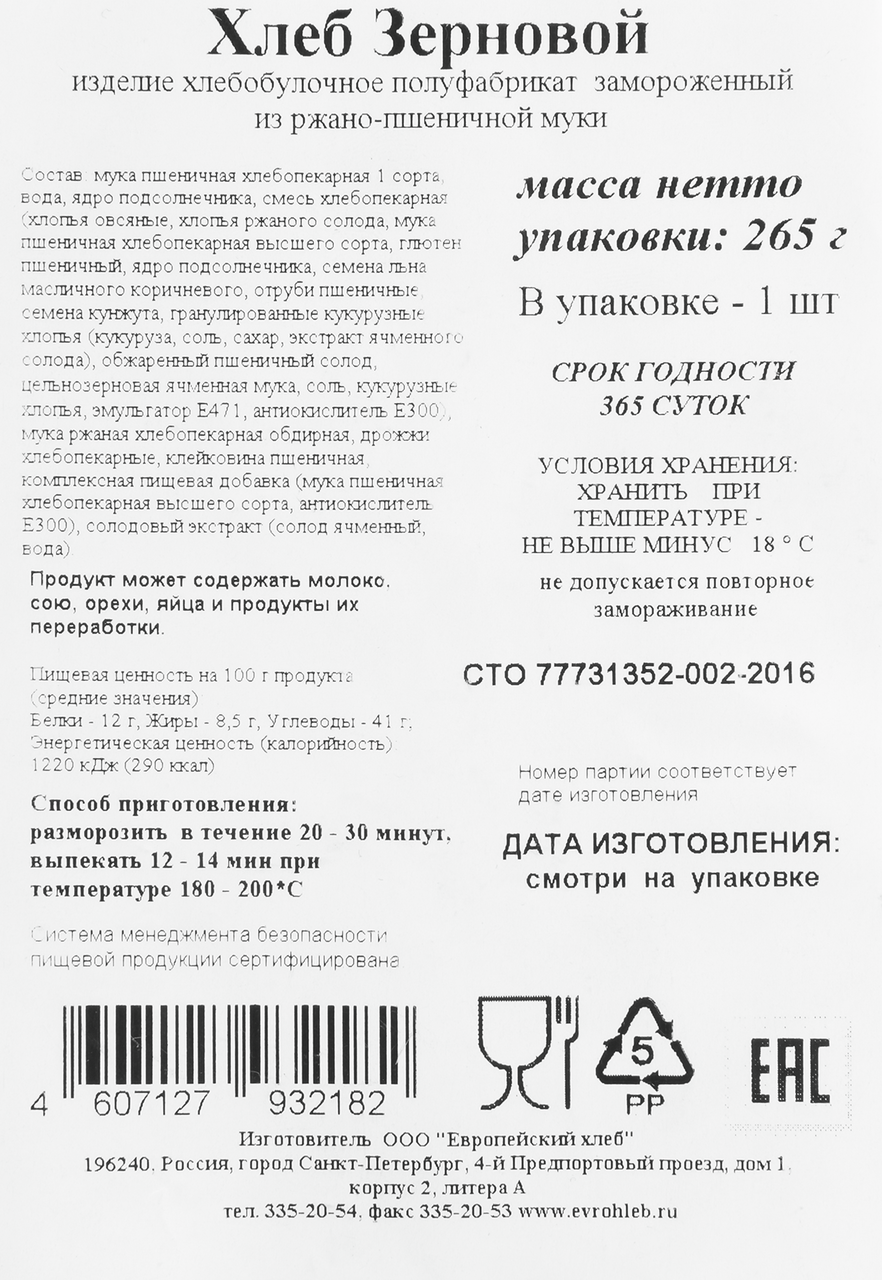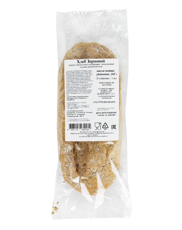 Хлеб Еврохлеб зерновой замороженный, 265г — очень вкусное и полезное хлебобулочное изделие, производимое из цельных зерен злаков, предварительно не измельченных в муку. Зерновой хлеб — ценный продукт, содержащий большое количество витаминов, микроэлементов и балластных веществ, необходимых для нормальной работы кишечника. Чтобы полакомится этим вкусным продуктом, необходимо выпекать его 15 минут в духовке, предварительно разморозив его в течение получаса.