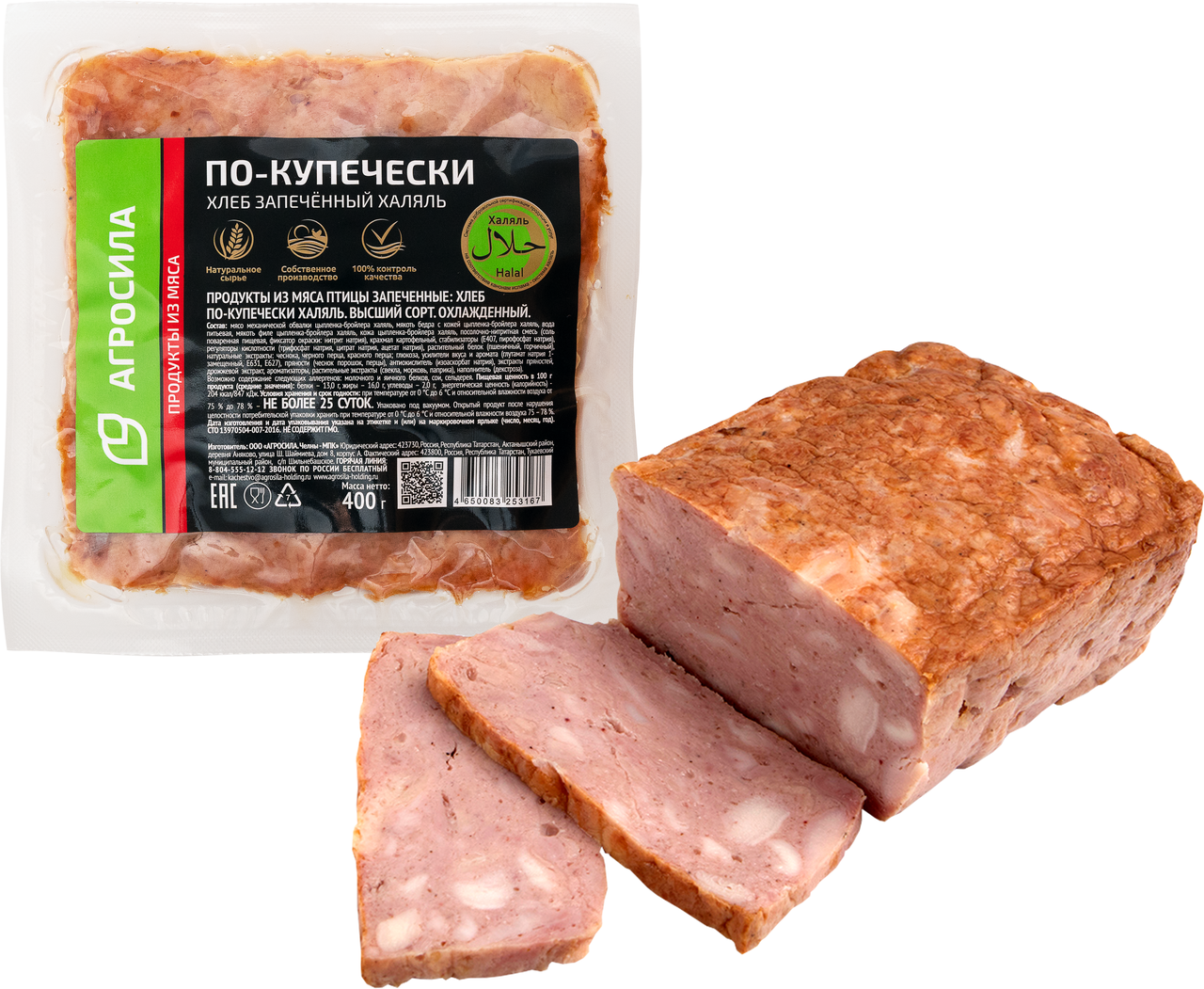 Хлеб Агросила Халяль По-купечески, 400г — продукт ручной работы. Изготавливается из мяса филе и бедра цыпленка-бройлера. Запекается в индивидуальной пресс-форме. Отличительная черта деликатеса — мраморный рисунок, достигаемый за счет натуральных красителей: свеклы, моркови и паприки.
