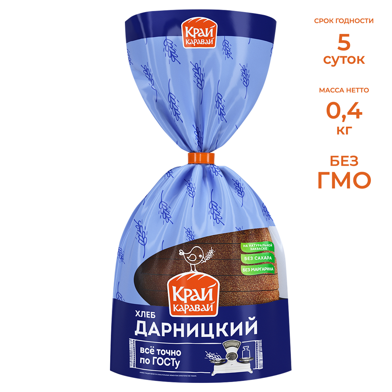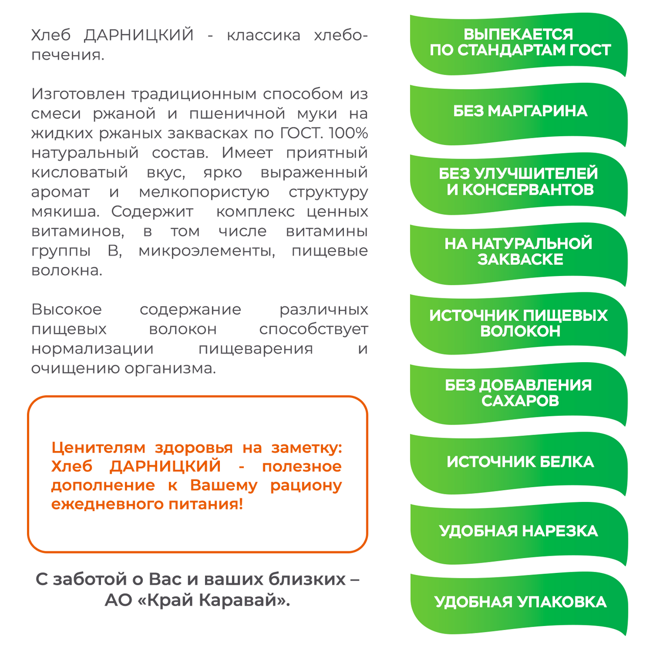 Хлеб Дарницкий торговой марки Край Каравай изготовлен на натуральной закваске по ГОСТу. В его составе отсутствуют сахар и маргарин. Великолепный вариант для горячего бутерброда, хрустящего тоста или сытного сэндвича. В составе продукта отсутствуют сахар и маргарин, поэтому он очень вкусный и полезный.
