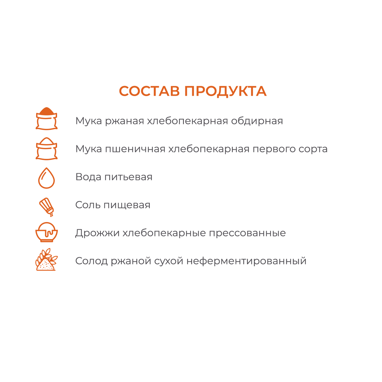 Вода питьевая, мука ржаная хлебопекарная обдирная, мука пшеничная хлебопекарная первого сорта, сахар, солод ржаной ферментированный, экстракт солодовый (солод ячменный, вода, солод пшеничный), соль, дрожжи хлебопекарные, кориандр, стабилизатор-ацетат кальция. Продукт может содержать следы семян кунжута, сои, молочных и яичных продуктов.