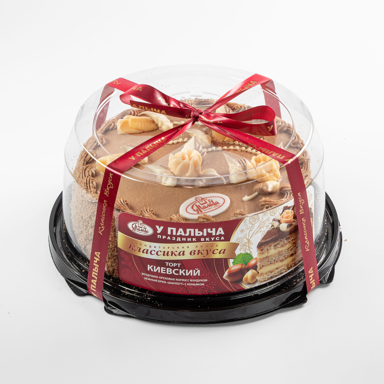 Торт Киевский У Палыча, 720г обладает округлой формой, состоит из двух белково-ореховых коржей, крема на основе сливок и шоколада. Боковые части торта посыпаны крошкой от коржей. Верхняя часть украшена разноцветным кремом, фруктовыми кусочками, цукатами. При изготовлении торта выполняется обжарка орехов, их измельчение и последующее перемешивание с мукой. Белки яиц взбивают с постепенным добавлением пудры сахара и ванили.