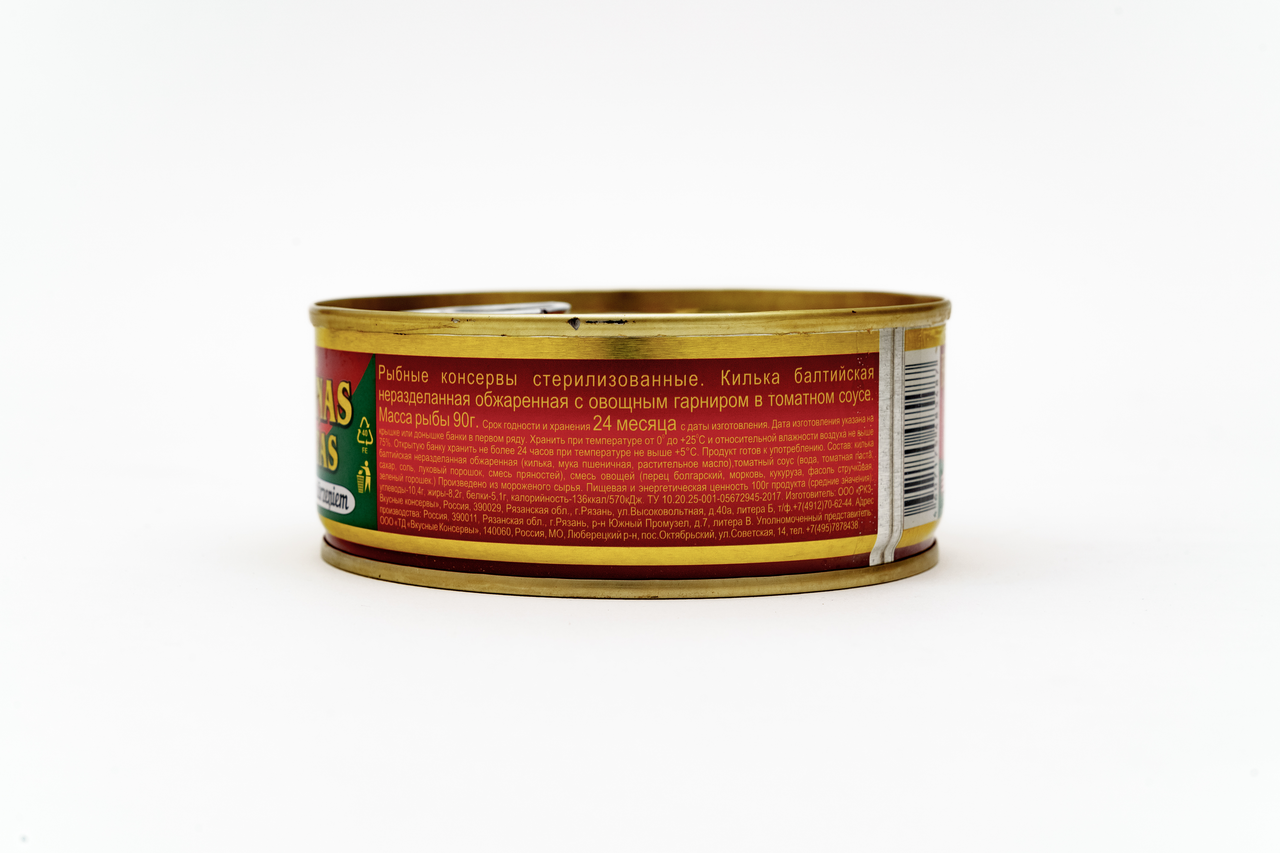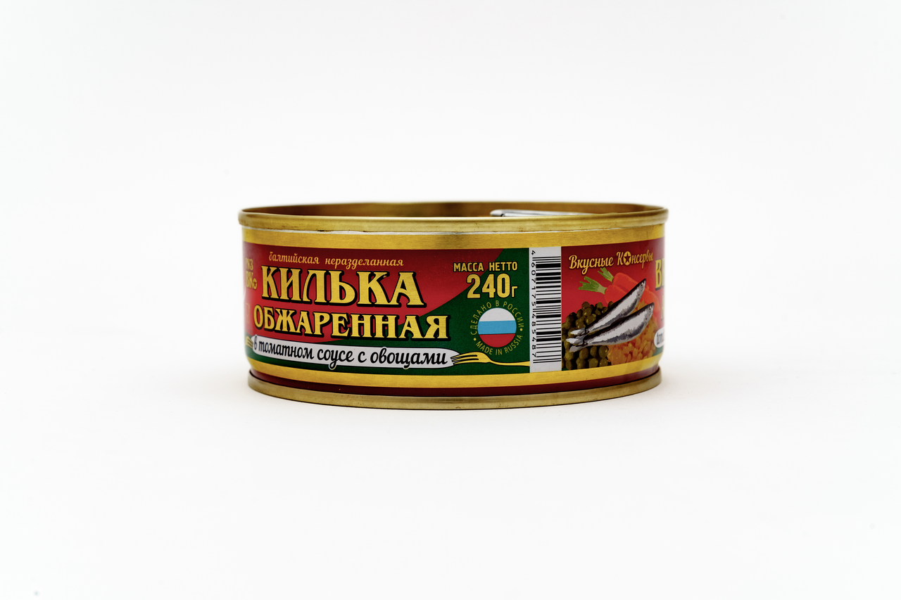 Килька обжаренная в томатном соусе с овощами ВКУСНЫЕ КОНСЕРВЫ, 240 г производится из натуральных высококачественных ингредиентов по традиционному рецепту. Она изготавливается из балтийской кильки, обжаренной в растительном масле, а в качестве заливки выступает томатный соус, приправленный пикантными пряностями. Рыба дополнена разнообразными овощами, что добавляет готовому блюду сытости. Продукт готов к непосредственному употреблению как самостоятельно, так и в сочетании с гарниром. Килька заключена в прочную жестяную банку-таблетку, которая легко вскрывается ключом. Металлическая емкость сохраняет первозданный вкус и аромат пищи, а материал не вступает в реакцию с продуктом. Рыба выловлена в Балтийском море и характеризуется увеличенным размером, поэтому в готовом виде сохраняет свою целостность и не разваливается на кусочки. Приобрести кильку обжаренную в томатном соусе с овощами ВКУСНЫЕ КОНСЕРВЫ, 240 г можно в торговом центре METRO.Бренд: Вкусные консервы.Адрес изготовителя: г. Камешково, Владимирская область.Страна-производитель: Российская Федерация.Вес: 240 г.Состав: килька балтийская неразделанная обжаренная (килька, мука пшеничная, растительное масло), томатный соус (вода, томатная паста, сахар, соль, луковый порошок, смесь пряностей), смесь овощей (перец болгарский, морковь, кукуруза, фасоль стручковая, зеленый горошек).Энергетическая ценность: 136 ккал.Пищевая ценность на 100 г продукта: белки – 5,1 г, жиры – 8,2 г, углеводы – 10,4 г.Условия хранения: при температуре 0 — 25 градусов при относительной влажности воздуха не более 75%.Срок хранения: 24 мес.Условия хранения открытой банки: при температуре не выше +5 градусов.Срок хранения открытой банки: 1 сут.Вид рыбных консервов: килька.Заливка: томатный соус.Формат: неразделанные.Вид обработки: стерилизованные.Сорт: высший.Упаковка: жестяная банка.