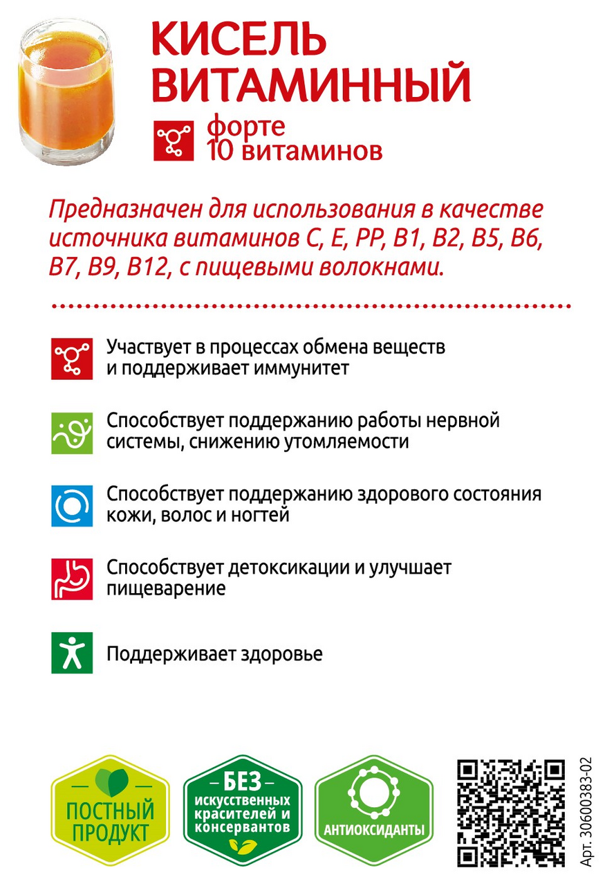 Вкусный напиток быстрого приготовления для укрепления здоровья. В составе фрукты, ягоды, пряности и комплекс из 10 витаминов. Витаминный напиток поддержит организм при строгой диете и авитаминозе, поможет восстановиться после болезни и укрепить здоровье. Компоненты киселя участвуют в процессах обмена веществ и поддерживают иммунитет (витамины РР, Е, С, В12, В9, В5, В1, абрикос, клюква), способствуют поддержанию работы нервной системы и снижению утомляемости (витамины С, РР, В12, В9, В2, В1), способствуют поддержанию здорового состояния кожи, волос и ногтей (биотин, абрикос, антиоксиданты – витамин С, РР, Е, В2,В1, куркума, клюква), способствуют детоксикации и улучшают пищеварение (яблоко, абрикос, куркума, свекла, витамины С, В12), способствуют снижению воспалительных процессов (куркума, витамин С, клюква). Полезный кисель витаминный упакован в порционные пакетики – удобно взять в дорогу или на работу. Сухой напиток не требует варки: просто залейте содержимое пакетика кипятком, и через 2 минуты витаминный напиток будет готов. Рекомендации по приготовлению: содержимое пакета залить 180мл кипящей воды, тщательно перемешать, через 2 минуты продукт готов к употреблению. Не содержит искусственных красителей и консервантов.