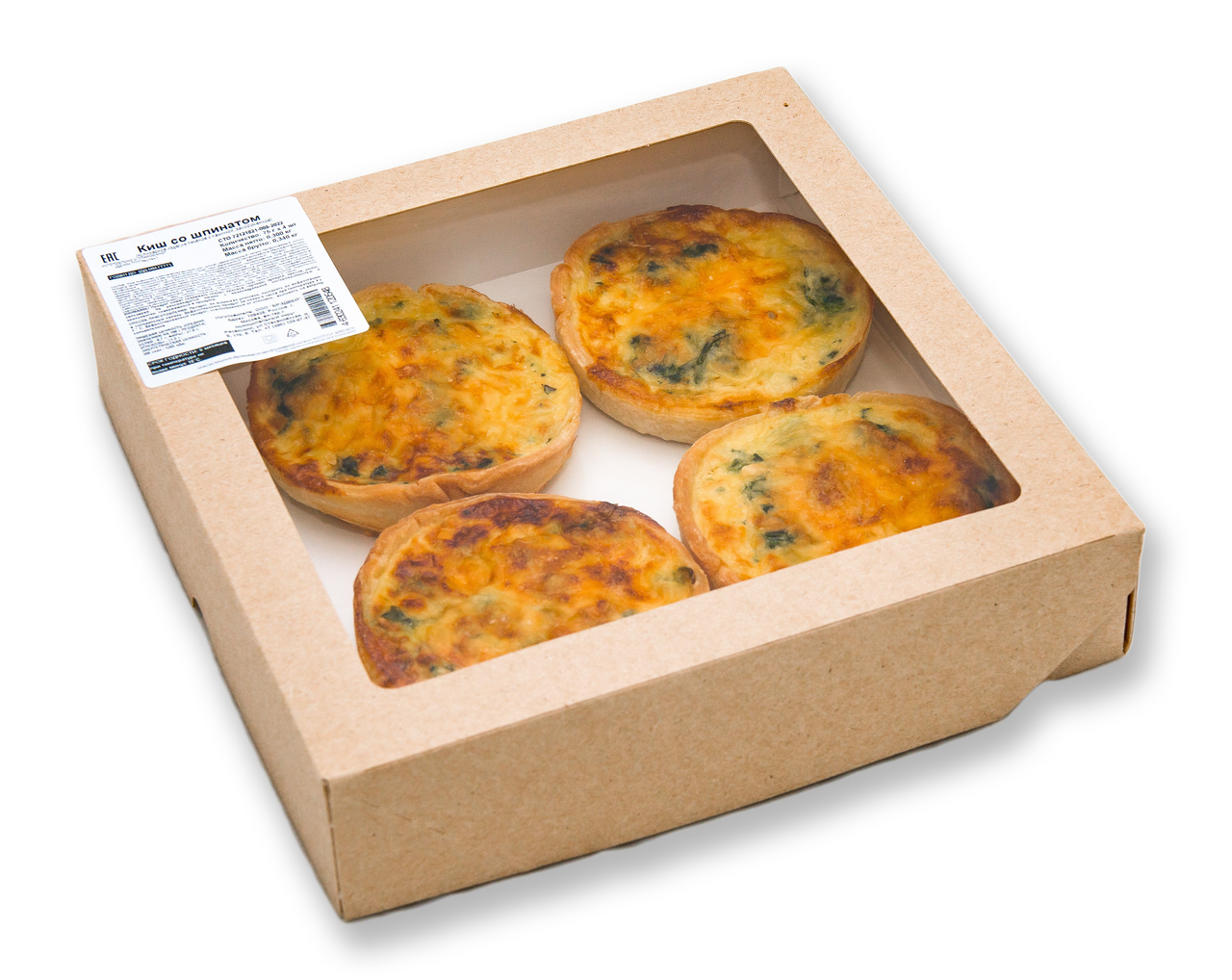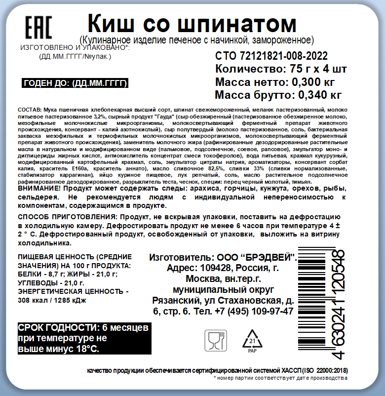 Мука пшеничная хлебопекарная высший сорт, шпинат свежемороженый, меланж пастеризованный, молоко питьевое пастеризованное 3,2%, сырный продукт Гауда сыр обезжиренный пастеризованное обезжиренное молоко, мезофильные молочнокислые микроорганизмы, молокосвертывающий ферментный препарат животного происхождения, консервант - калий азотнокислый, сыр полутвердый молоко пастеризованное, соль, бактериальная закваска мезофильных и термофильных молочнокислых микроорганизмов, молокосвертывающий ферментный препарат животного происхождения, заменитель молочного жира рафинированные дезодорированные растительные масла в натуральном и модифицированном виде пальмовое, подсолнечное, соевое, рапсовое, эмульгатор моно- и диглицериды жирных кислот, антиокислитель концентрат смеси токоферолов, вода питьевая, крахмал кукурузный, модифицированный картофельный крахмал, соль, эмульгатор цитраты натрия, ароматизаторы, консервант сорбат калия, краситель Е160а, краситель аннато, масло сливочное 82,5%, сливки 33% сливки нормализованные, стабилизатор каррагинан, яйцо куриное пищевое, лук репчатый, соль, масло растительное подсолнечное рафинированное дезодорированное, разрыхлитель теста, чеснок, специи: перец черный молотый, тимьян.