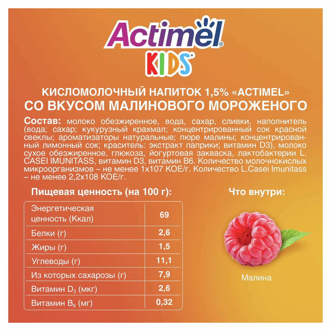 Молоко обезжиренное, вода, сахар, сливки, наполнитель (вода, сахар, кукурузный крахмал, концентрированный сок красной свёклы, ароматизаторы натуральные; пюре малины, концентрированный лимонный сок, краситель, экстракт паприки; витамин D3), молоко сухое обезжиренное, глюкоза, йогуртовая закваска, лактобактерии L. CASEI IMUNITASS, витамин D3, витамин B6.