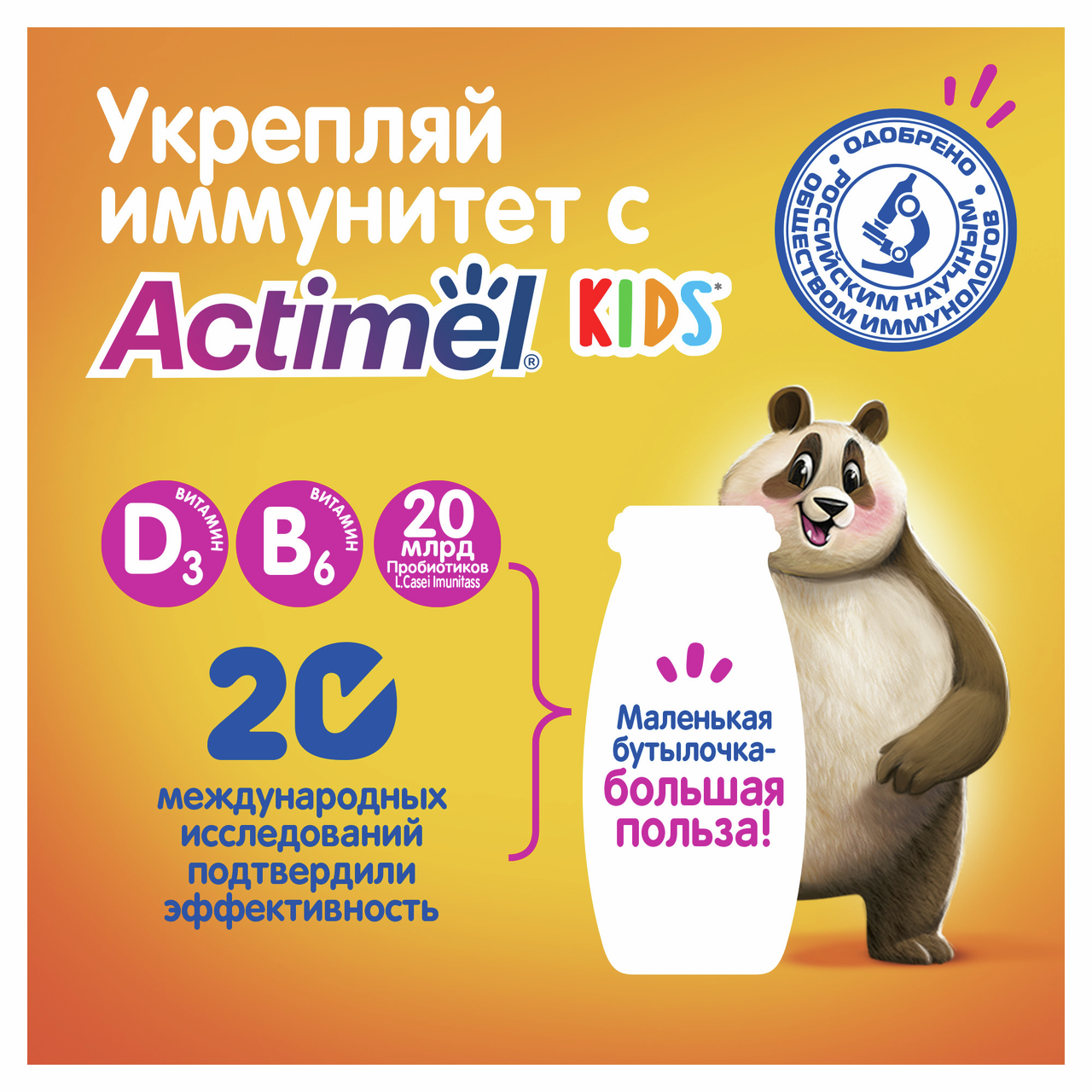 Это функциональный продукт со вкусом ягодного мороженого, созданный специально для детей с 3 лет. В его состав входит уникальный комплекс полезных лактобактерий и витаминов, необходимых растущему организму. Пробиотик L.Casei нормализует микрофлору кишечника и защищает ее от микробов. L.Rhamnosus дополняет его действие, укрепляя иммунитет. Витамины помогают сопротивляться инфекциям и придают ребенку сил. Институт питания РАМН рекомендует Имунеле для ежедневного применения, особенно в холодное время года