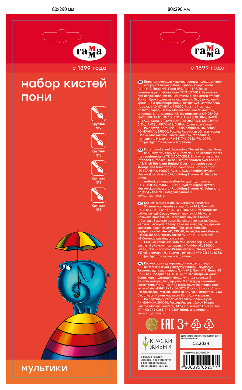 В наборе из 4 кистей Гамма пони серии Мультики собраны востребованные номера кистей круглой формы: № 2,3,5,7. Набор прекрасно подойдет для всех видов красок. Кисти упакованы в красивый яркий блистер и станут незаменимыми помощниками для юных художников, а также хорошим подарком всем, кто увлекается творчеством.