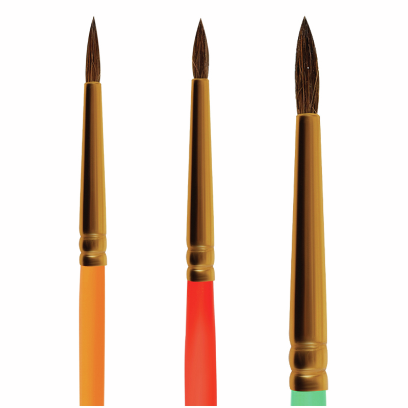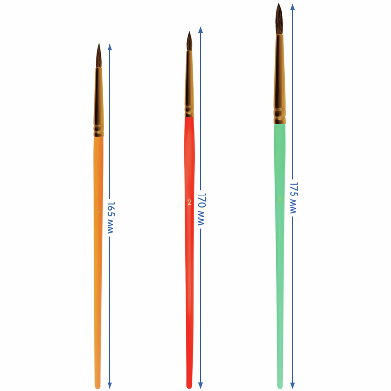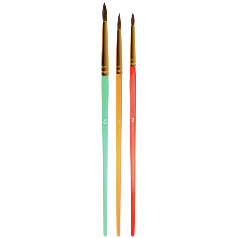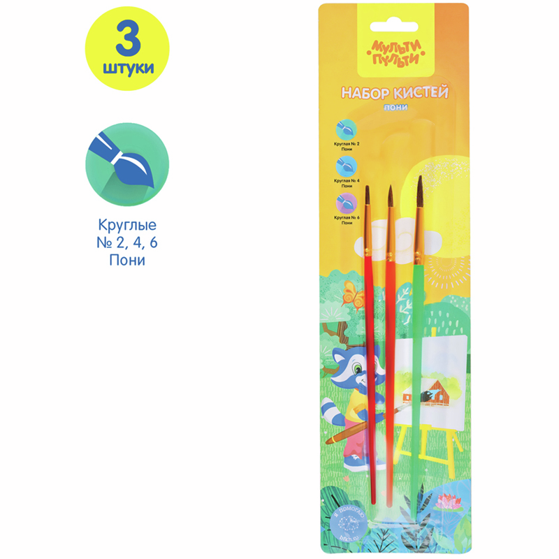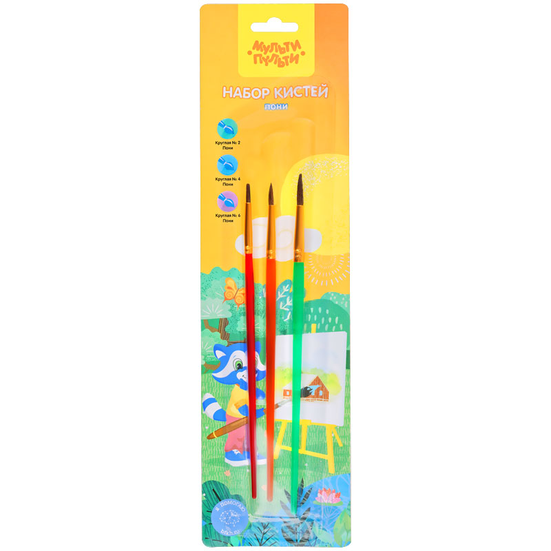 Набор кистей Мульти-Пульти Пони круглые 2 4 6, 3шт предназначен для детей с начальным и средним уровнем подготовки. В набор входят 3 круглые кисти № 2, 4, 6. Волос пони средней жесткости и по структуре толще чем волос белки, поэтому влаги такая кисть набирает меньше. Прозрачные пластиковые ручки не боятся воды, легко моются и отлично смотрятся. Кисти имеют двойной обжим обоймы и надежное клеевое скрепление с корпусом ручки.