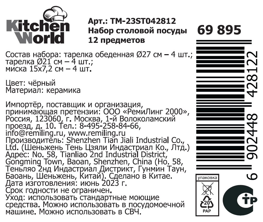 Набор столовой посуды Kitchen World Land Black 12 предметов рассчитан на 6 человек. Комплект включает в себя обеденные, десертные и глубокие тарелки круглой формы. Материалом для изготовления служит прочная керамика высокого качества, характеризующаяся устойчивостью к появлению разных повреждений – потертостей, сколов. За счет своего привлекательного и аккуратного внешнего вида посуда станет ярким украшением обеденного или праздничного стола. Стильный сервиз поможет пробудить аппетит и сделать любой процесс употребления пищи торжественным. Изделия из керамики не выделяют вредных для здоровья элементов, не деформируются и не впитывают запахи. Материал характеризуется устойчивостью к внешнему воздействию и хорошо переносит посудомоечную машину. Комплект поставляется в прочной упаковке из картона, оформленной в яркие цвета, что дает возможность использовать набор в качестве подарка родному и близкому человеку. Керамическая посуда характеризуется простотой в уходе, поэтому подходит для ежедневного использования.