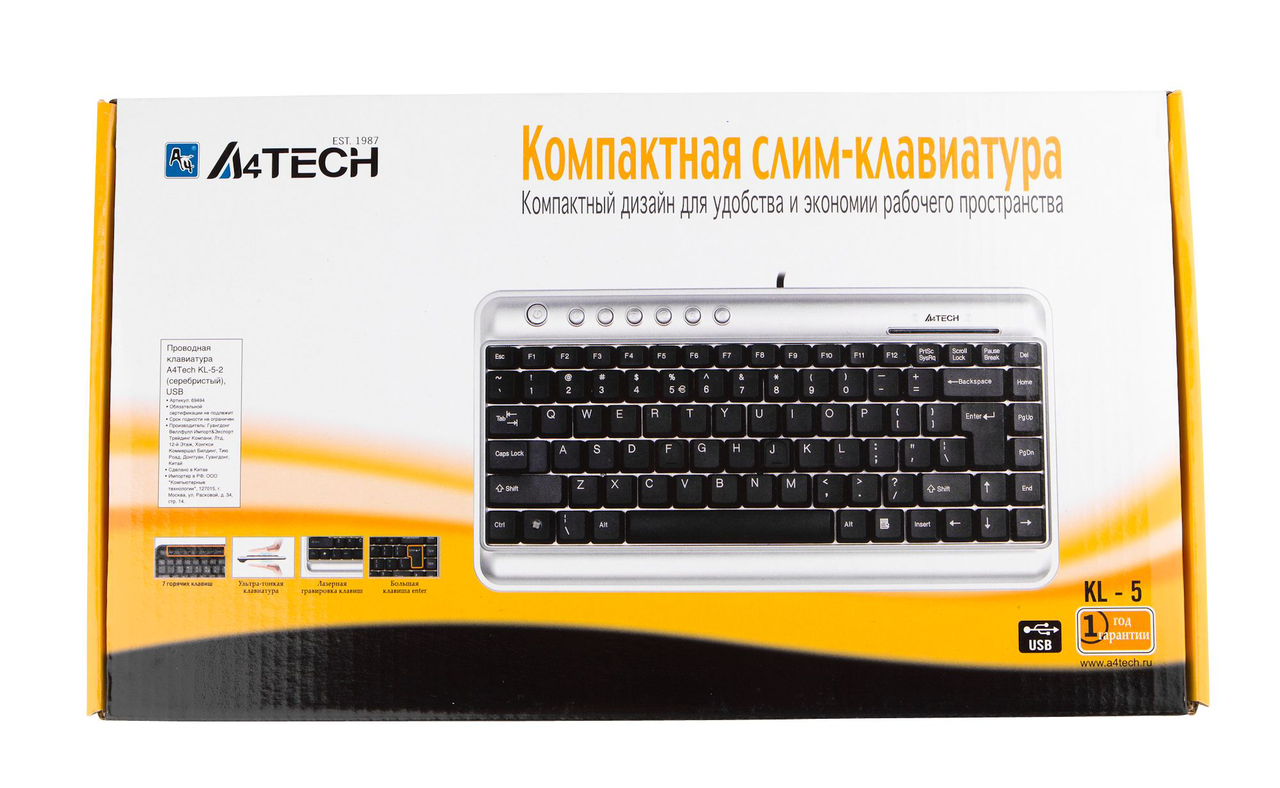 Мини-клавиатура A4tech KL-5 USB+PS/2, модный тонкий дизайн, тихий ''ноутбучный'' ход клавиш, 7 горячих клавиш.