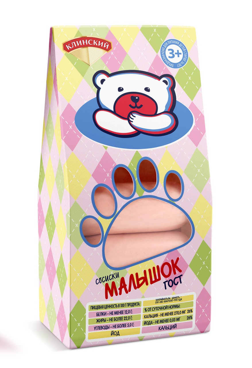 Сосиски Клинский Малышок, 180г производятся в соответствии с требованиями ГОСТа из говядины и свинины с молоком и яйцами, в них пониженное содержание соли, нет фосфатов, ГМО, глутаматов. Маленькие, мягкие, но упругие, ароматные, с нежным вкусом с молочно-сливочными нотками — их легко подогреть, чтобы подать с пюре, овощами или гарниром из круп.