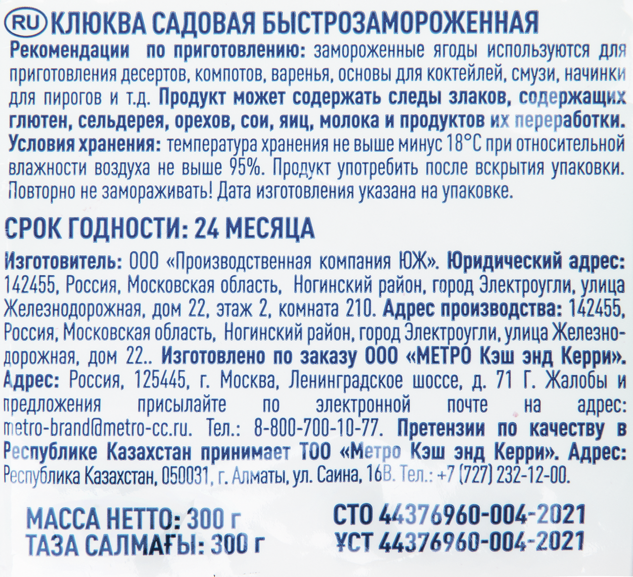 METRO Chef Клюква садовая быстрозамороженная, 300г