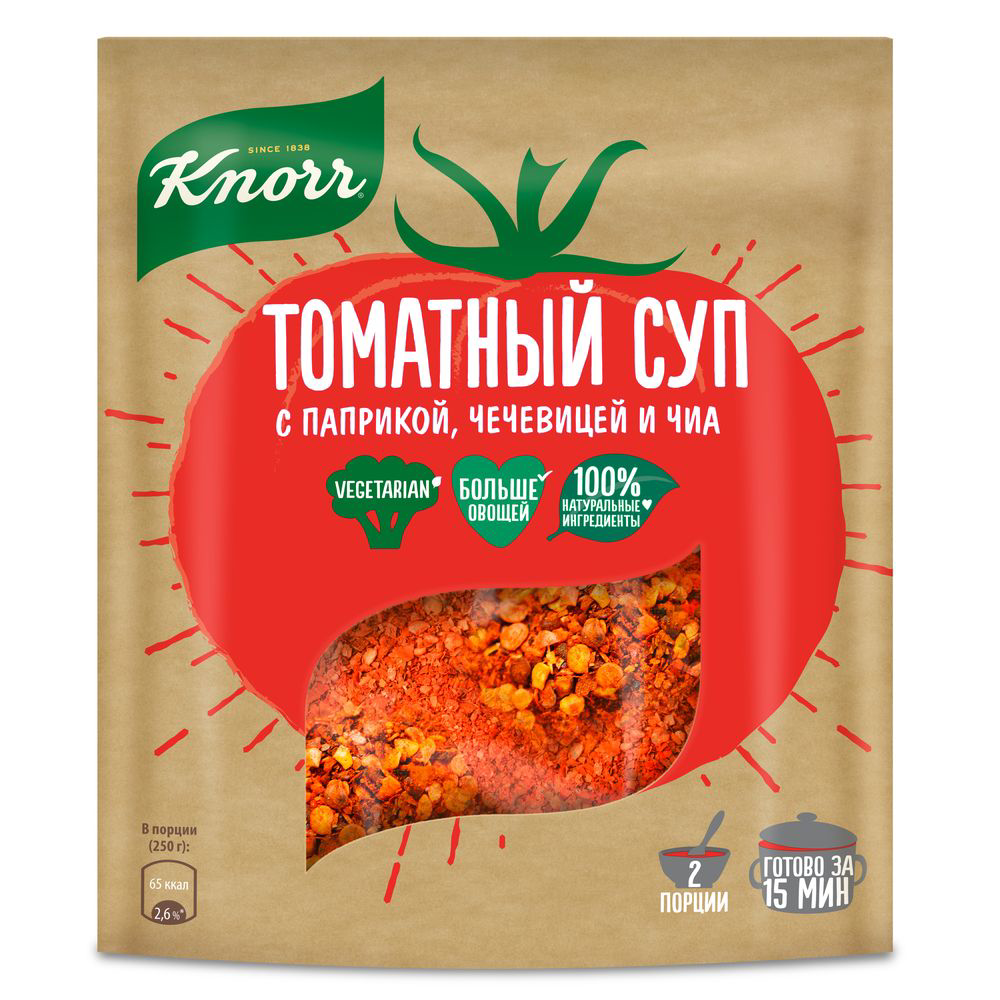 Томатный суп с паприкой, красной чечевицей и семенами чиа – идеальное решение для первого блюда на обед или ужин. Томатный суп с крупами очень быстро и просто готовить! Время приготовления составляет всего 15 минут, а в каждой пачке содержатся сразу 2 порции. Если у вас нет времени на приготовление сложного обеда, томатный суп с крупами от Knorr — отличный вариант вкусного и полезного блюда.В Knorr, мы всегда гордились качеством наших продуктов — от выбора ингредиентов и до найма самых опытных и талантливых поваров. Для томатного супа Knorr использует только натуральные и отборные ингредиенты, поэтому суп обладает 100% чистым составом, что делает его особенно привлекательным для гурманов и ценителей качества. Сейчас мы ставим эту страсть к качеству на службу ответственному и устойчивому развитию, поскольку верим: по-настоящему вкусными будут те продукты, которые выращены с любовью к нашей планете. Упаковка томатного супа состоит из экологичных материалов и на 100% готова к переработке, а для производства используется энергия с ветряных электростанций.Как известно, томаты способствуют улучшению работы сердечно-сосудистой системы, укреплению костей, а также обладают противовоспалительными свойствами.Томатный суп с паприкой, красной чечевицей и семенами чиа от Knorr придется по вкусу не только взрослым, но и детям, ведь в нем нет пряных специй, которые не привычны для детского рациона.
