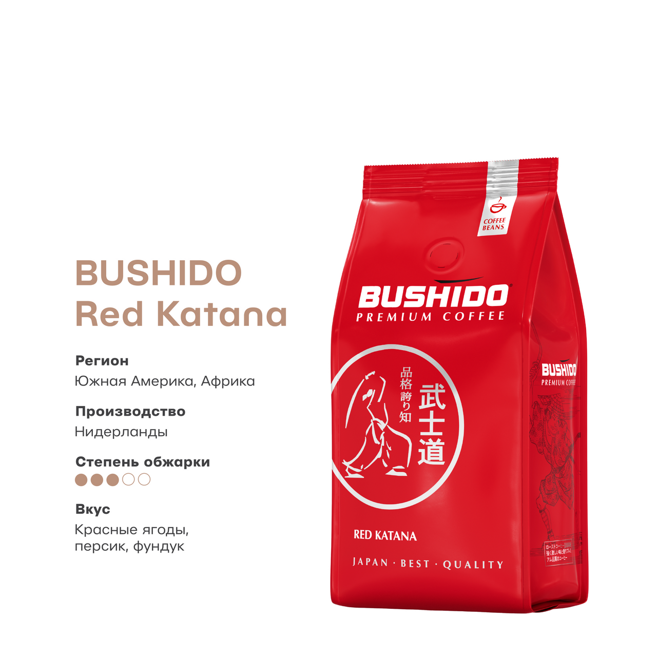 BUSHIDO Red Katana 227 г - натуральный зерновой кофе из 100% премиальной арабики. Словно катаной, мы отсекали всё лишнее в поисках идеальной комбинации вкусов, пока не пришли к абсолютному балансу сладости красных ягод, лёгкой кислинки спелого персика и завершающих нот фундука. Обжарка CITY раскрывает глубину вкуса. BUSHIDO - смелый эксперимент по объединению японской философии и европейской кофейной культуры.