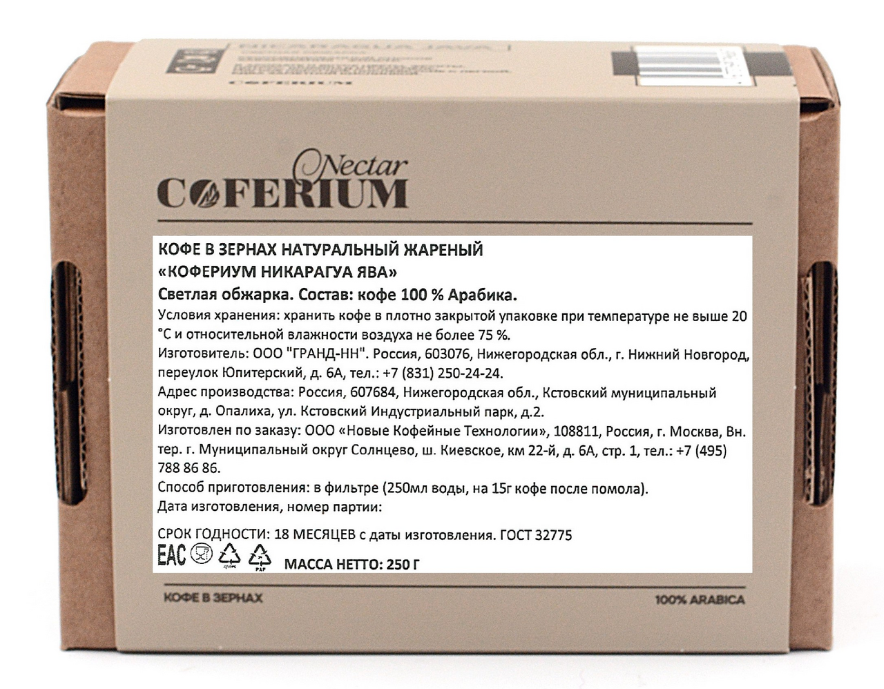 Кофе Coferium Nicaragua Java зерновой, 250г