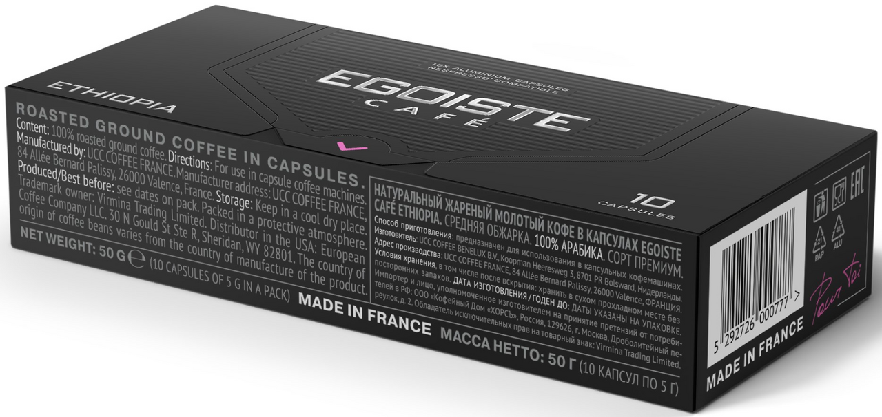 EGOISTE Ethiopia - кофе в капсулах для кофемашины NESPRESSO. 10 капсул (50 г). 100% премиальная молотая арабика. Интенсивность 6/10.Лёгкий и элегантный вкус с цитрусовой кислинкой, сбалансированной цветочной сладостью. Подходит для любой капсульной кофемашины, поддерживающей формат NESPRESSO.EGOISTE - кофе для тех, кому трудно угодить.
