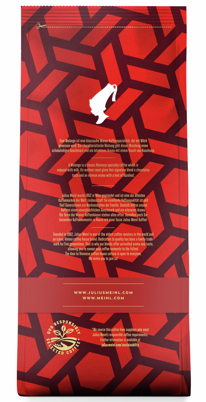 Меланж - традиционный венский кофе с добавлением молока вдохновил Julius Meinl на создание уникального бленда. Идеально сбалансированный вкус с нотами шоколада, плотная текстура и насыщенный аромат с оттенком лесного ореха – великолепная основа для капучино, латте или флэт уайт. Уникальный вкус создан специально для приготовления меланжа - традиционного кофе из Австрии, в котором эспрессо и взбитое молоко смешиваются в равных долях. Смесь так же хороша, чтобы готовить другие виды кофе с молоком - капучино, латте или моккачино.