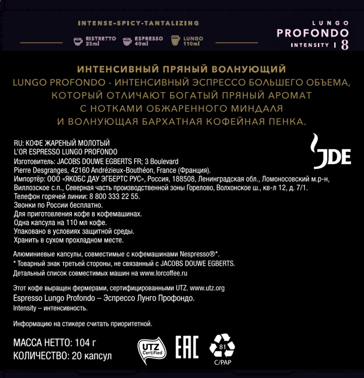 Кофе в капсулах L’or Lungo Profondo для кофемашин Nespresso 20шт, 104г