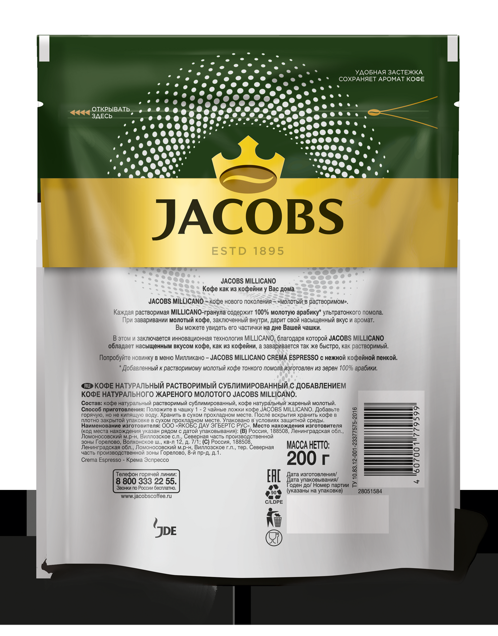 Кофе Jacobs Millicano молотый в растворимом, 200г