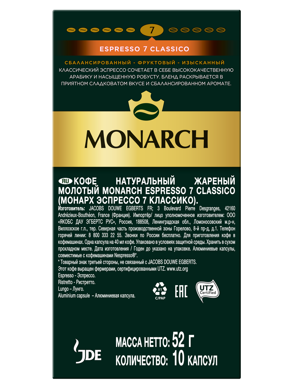 Кофе в капсулах Monarch Espresso Classico для кофемашин Nespresso 10шт, 52г