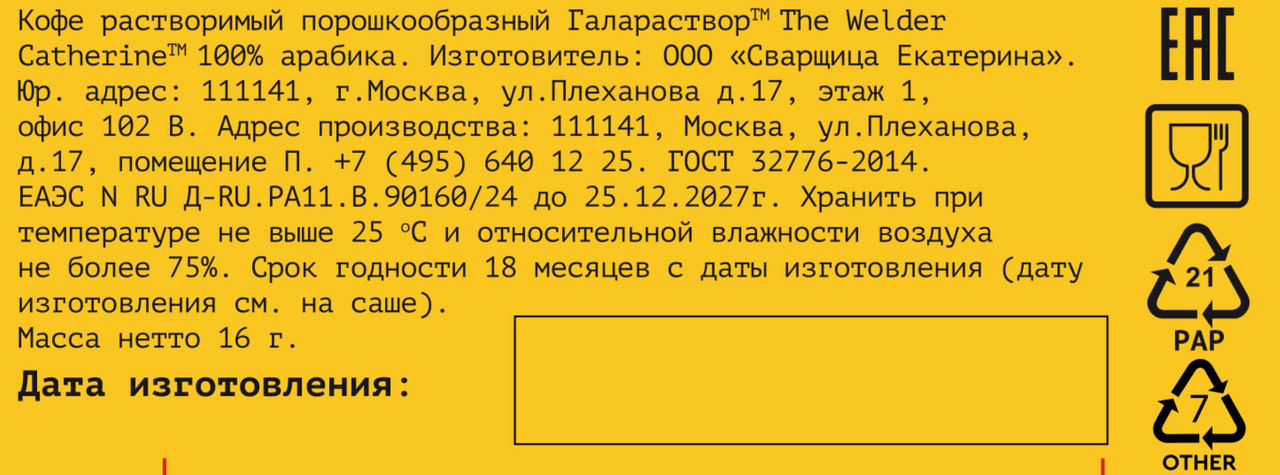 Кофе Сварщица Екатерина Галараствор Эфиопия Ворка растворимый (3.2г x 5шт), 16г