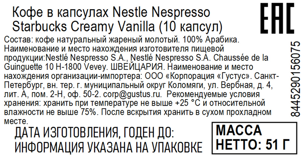 Кофе в капсулах для кофемашин Starbucks Creamy Vanilla 10шт, 51г