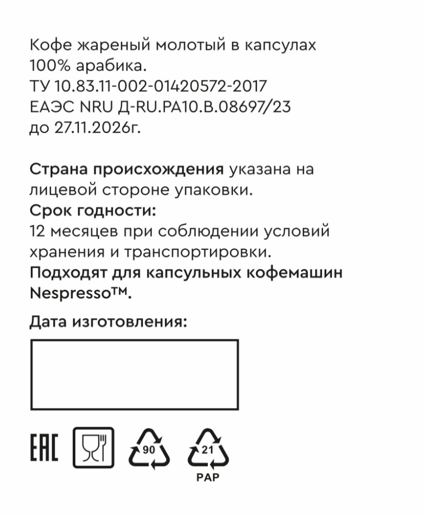 Спешелти кофе в капсулах формата Nespresso, обжарка под молоко. Краткое описание вкуса: сбалансированный, плотный, сладкий, бергамот, абрикос, шоколад.