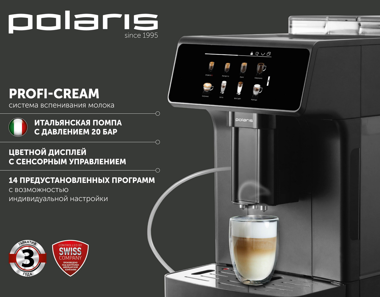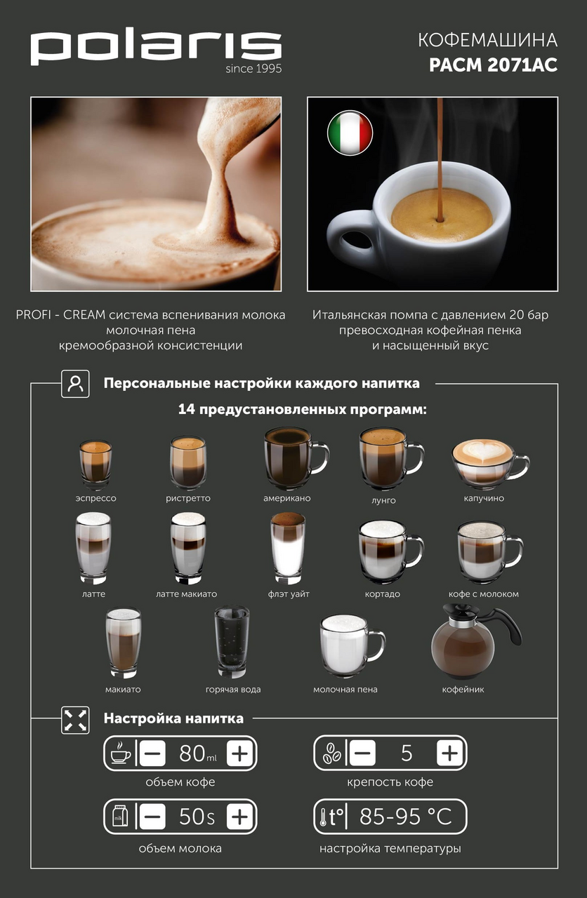 Стильный, современный и эргономичный дизайн этой кофемашины станет украшением вашей кухни.Это современная кофемашина с цветным сенсорным дисплеем и 14 автоматическими программами на любой вкус, от классического эспрессо до изысканного флэт уайта.Создавайте свой идеальный напиток, используя безграничные возможности персональных настроек: регулируйте крепость, температуру, объем и количество молока!Итальянская помпа с давлением 20 бар гарантирует насыщенный вкус и превосходную пенку, а удобный интерфейс сделает процесс приготовления легким и приятным.