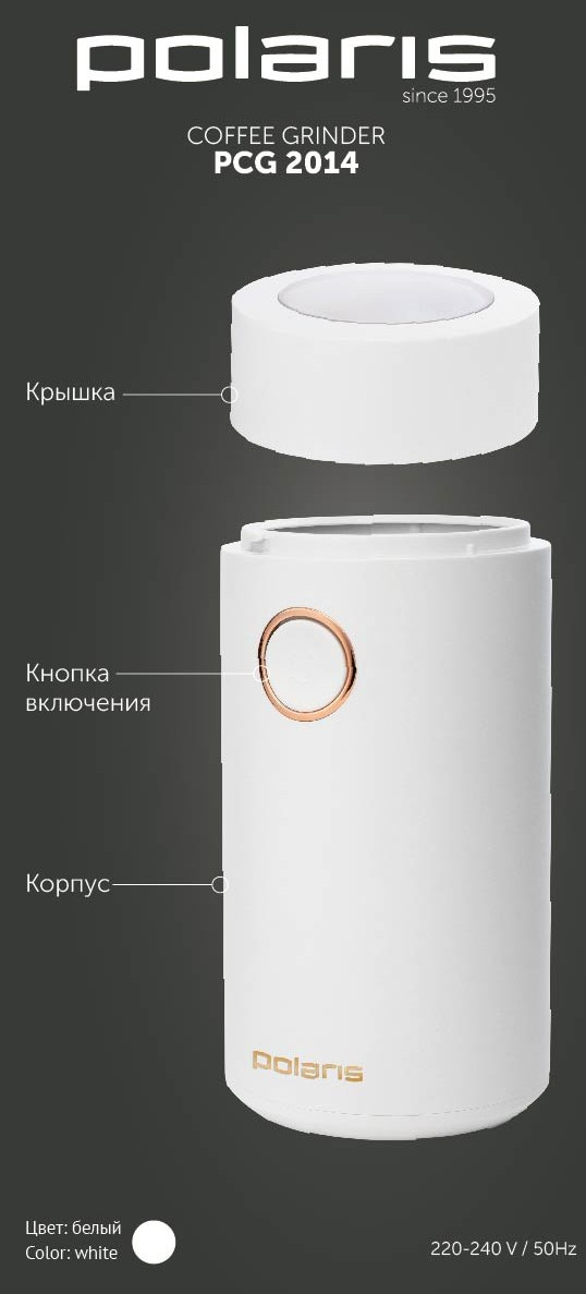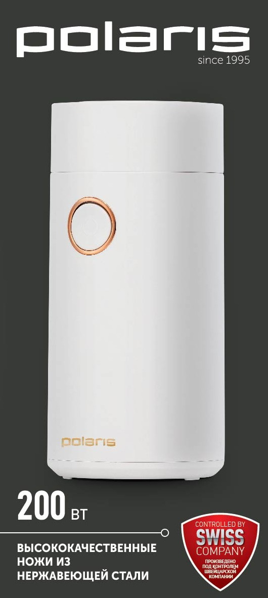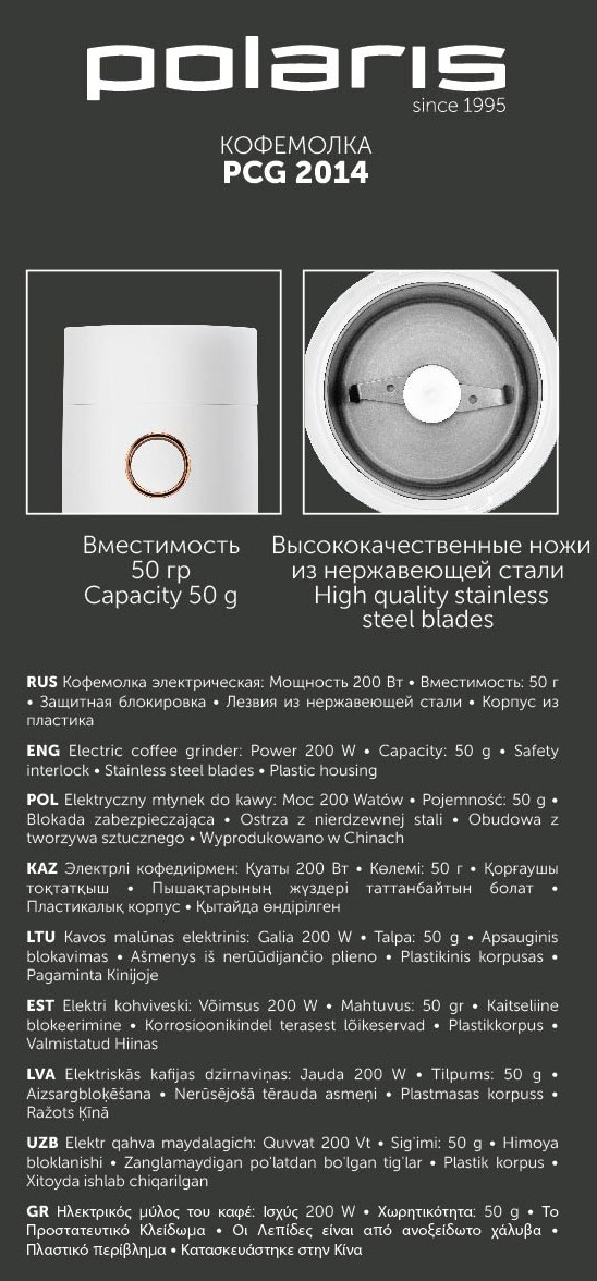 Модель рассчитана на загрузку 50 граммов зерен и оснащена высококачественными ножами из нержавеющей стали. Безопасность работы прибора обеспечивает функция блокировки при снятой крышке. Мощность кофемолки составляет 200 ватт. Имеет импульсный режим работы.