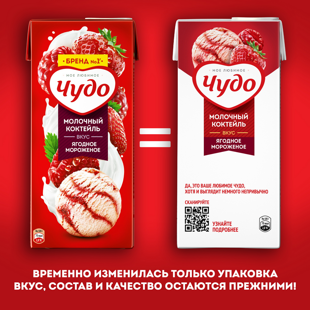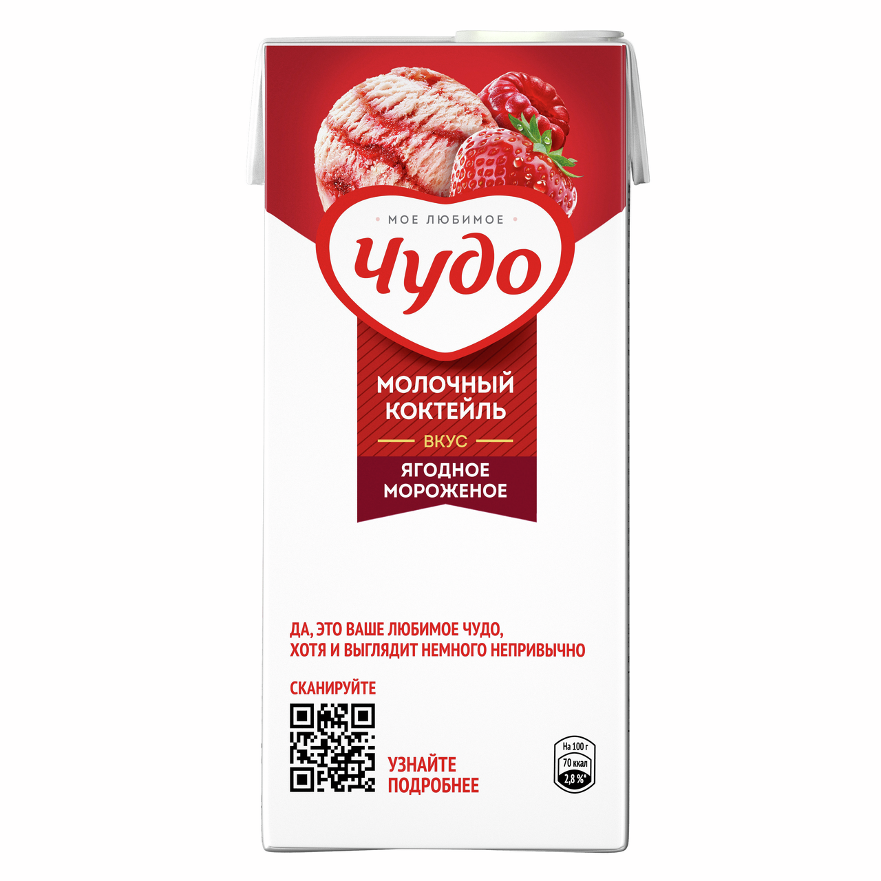 Коктейль молочный Чудо Ягодное мороженое 2% – это вкусный и полезный напиток, приготовленный на основе натурального коровьего молока с добавлением сахара и прочих компонентов. Отличается приятным, в меру сладковатым вкусом с нежными нотками настоящего ягодного мороженого. Не содержит консервантов и растительных жиров. В процессе производства подвергается стерилизации, позволяющей продлить срок хранения напитка, но при этом сохранить природную пользу свежего молока. Идеально подходит как для ежедневного употребления, так и для детских праздников. Современная многослойная упаковка тетрапак надежно сохраняет свежесть и вкусовые свойства в пределах всего срока годности.