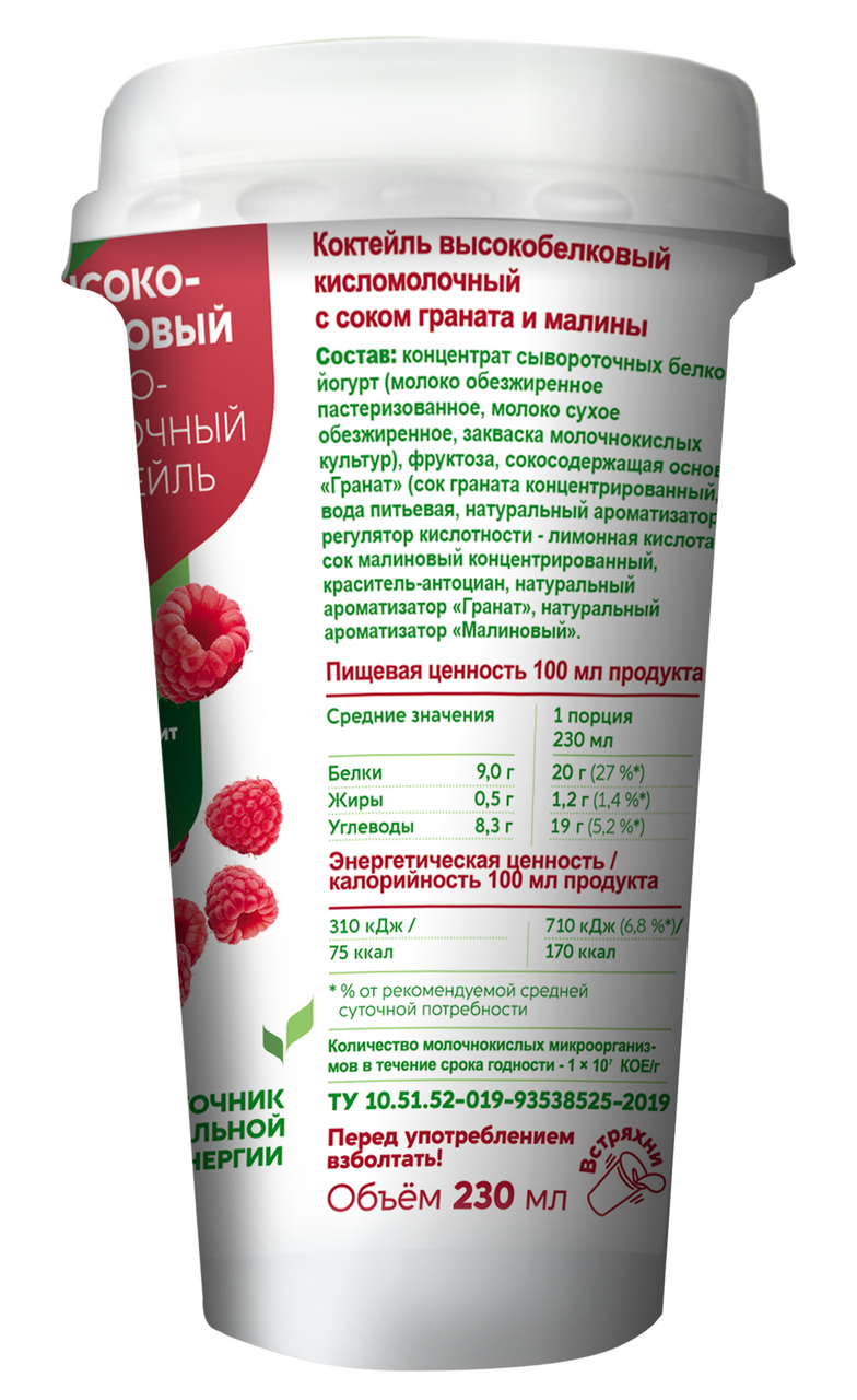 Полезный, натуральный, кисломолочный коктейль со вкусом граната и малины, содержащий низкое количество жира. Напиток в современной удобной упаковке, позволяющей быстро перекусить и на ходу, и даже в машине.