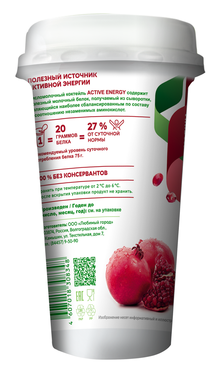 Коктейль кисломолочный Active Energy Гранат-малина 0.5%, 230мл