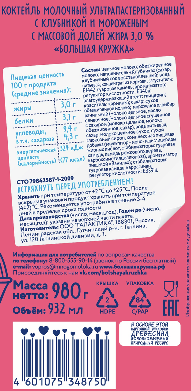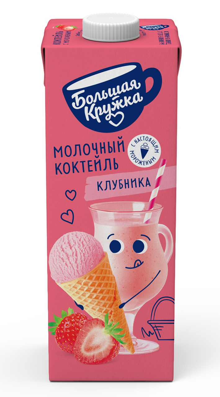Коктейль молочный Большая кружка клубника 3%, 980г