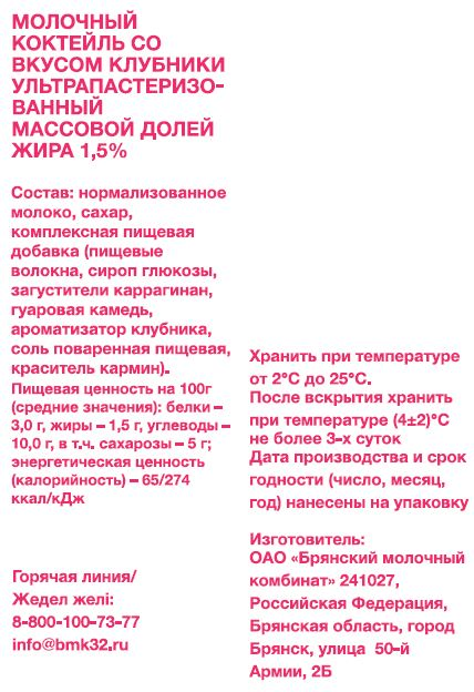 Нормализованное молоко, сахар, комплексная пищевая добавка пищевые волокна, сироп глюкозы, загустители каррагинан, гуаровая камедь, ароматизатор клубника, соль поваренная пищевая, краситель кармин.