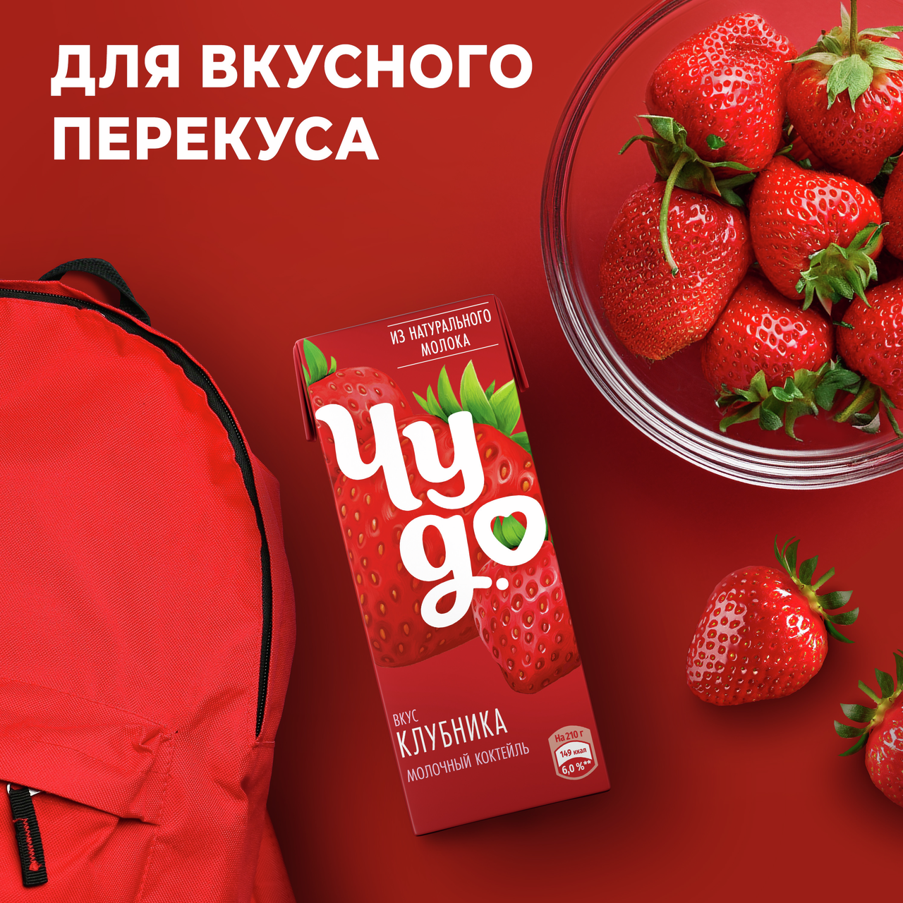 Молочный коктейль Чудо с клубничным вкусом. Нежный молочный коктейль, обладает приятным вкусом клубники, отлично подходит для перекуса, удобно брать с собой.