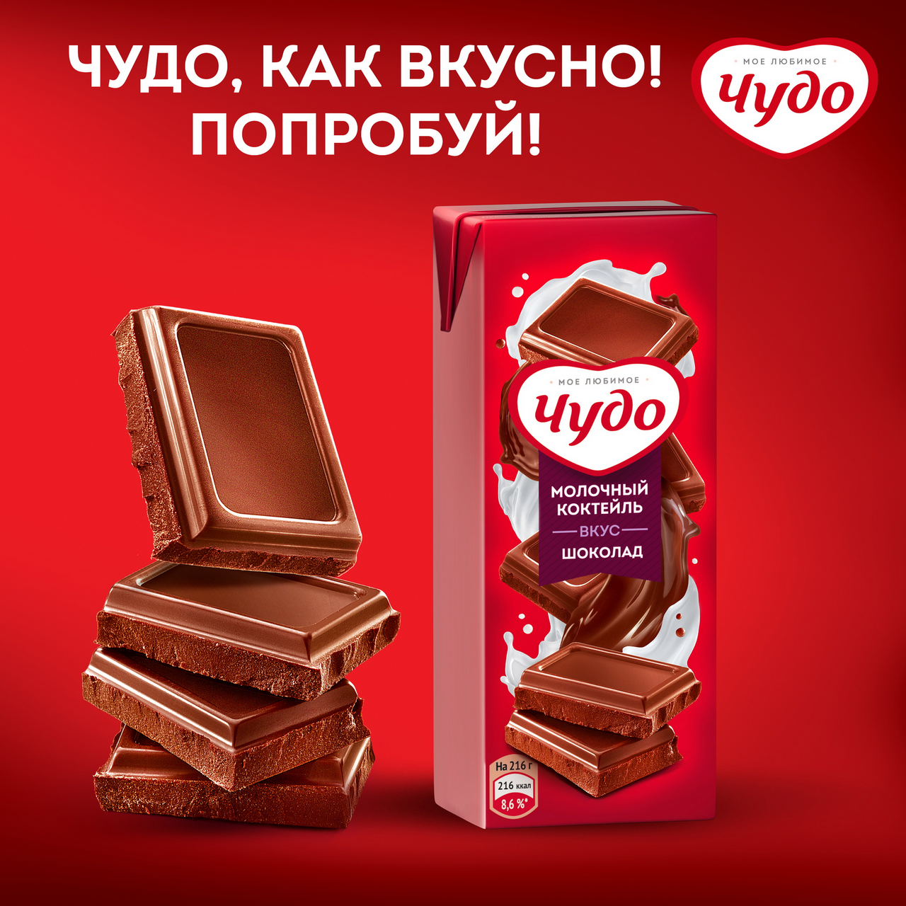 Коктейль "Чудо Шоколад" - питательный, густой и вкусный напиток. Коктейль зарядит энергией, подарит заряд бодрости и хорошего настроения на целый день. Благодаря удобной упаковке продукт можно носить с собой и выпить его в любое удобное время.Ультрапастеризованный.