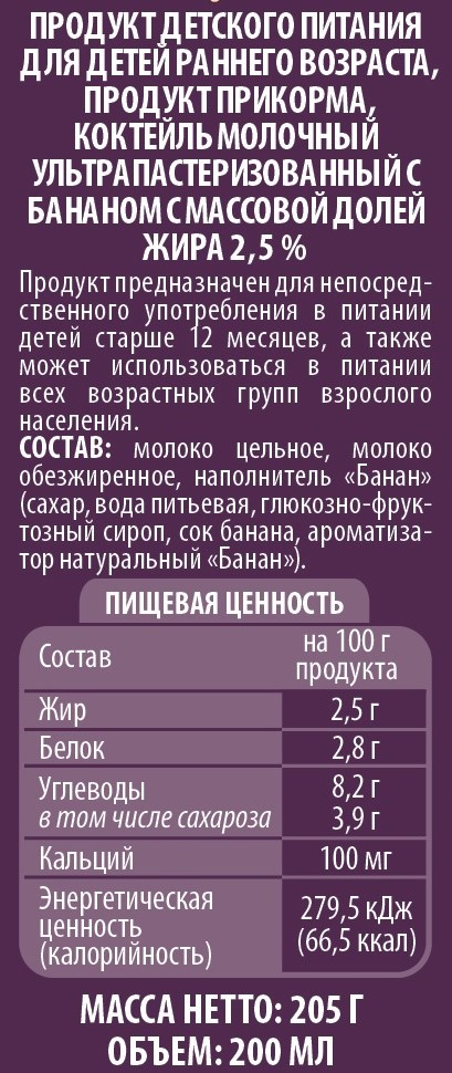 Предназначен для питания детей старше 12 месяцев. Он приготовлен из нормализованного по уровню жирности молока с добавлением бананового сока и сахара. Напиток умеренно сладкий, с приятным и ненавязчивым банановым вкусом.