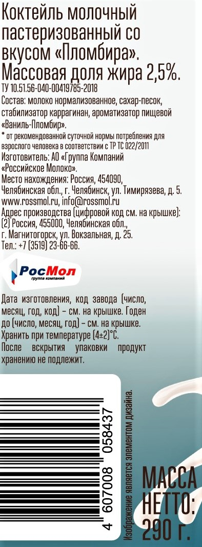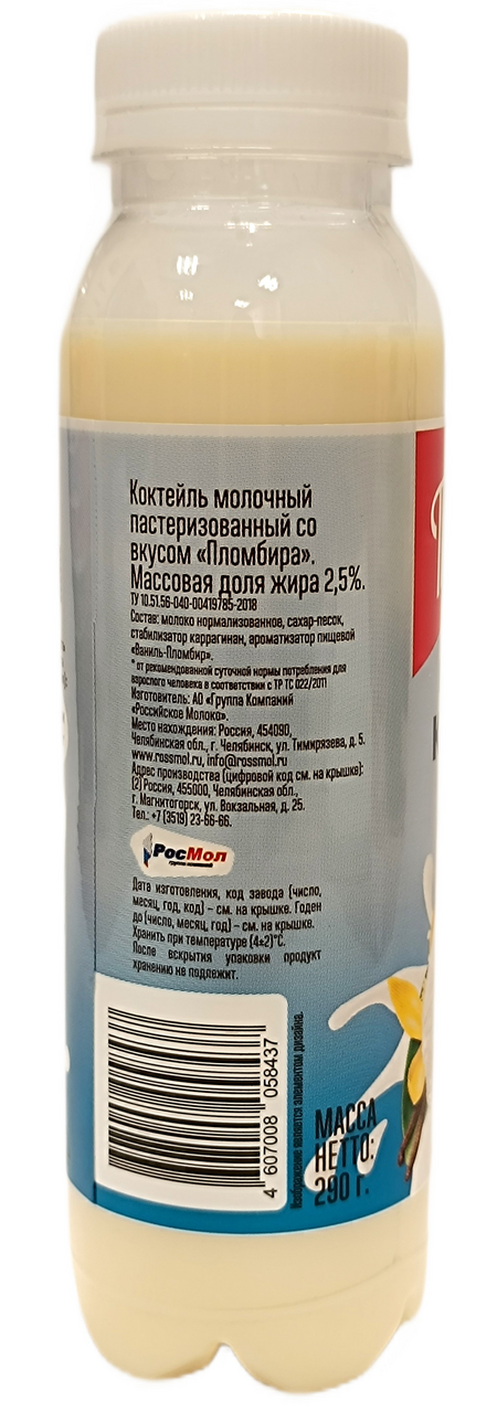 Коктейль молочный пастеризованный со вкусом Пломбира. Этот коктейль напоминает пломбир, который можно пить охлаждённым. Его также можно добавить в кофе.