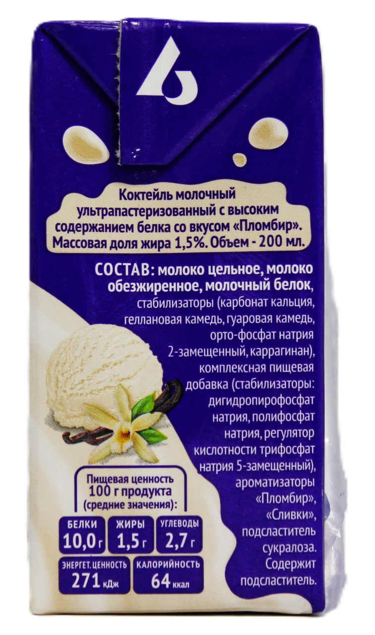 Молоко цельное, молоко обезжиренное, молочный белок, стабилизаторы карбонат кальция, геллановая камедь, гуаровая камедь, орто-фосфат натрия 2-замещенный, каррагинан, комплексная пищевая добавка стабилизаторы: дигидропирофосфат натрия, полифосфат натрия, регулятор кислотности трифосфат натрия 5-замещенный, ароматизатор Пломбир, ароматизатор Сливки, подсластитель сукралоза.