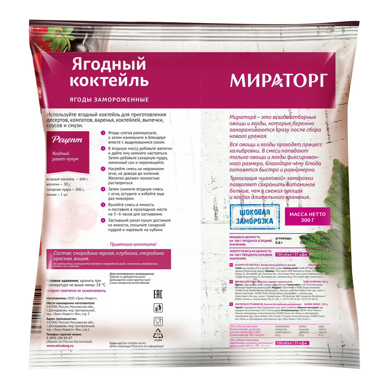 Ягодный микс из красной и черной смородины, вишни и клубники идеально подходит для приготовления компотов, начинки для пирогов и даже ягодного рахат-лукума, подробный рецепт которого, указан на упаковке. Ароматный ягодный коктейль, состоящий из черной и красной смородины, вишни и клубники, станет прекрасным витаминным лакомством и ярким ингредиентом для компотов, варенья, любой выпечки, ягодно-фруктовых соусов и смузи. Несомненным преимуществом быстрозамороженных ягод является то, что они, подвергаясь глубокой шоковой заморозке, на 95% сохраняют полезные свойства свежего продукта, просты в приготовлении и так же вкусны. При применении этой технологии не требуется никаких дополнительных, вредных для здоровья потребителя, химических добавок.